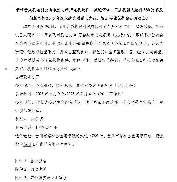 浙江臺興機(jī)電科技有限公司年產(chǎn)電機(jī)配件、減速箱體、工業(yè)機(jī)器人配件880萬套及伺服電機(jī)30萬臺技術(shù)改造項(xiàng)目(先行)竣工環(huán)境保護(hù)自行驗(yàn)收公開