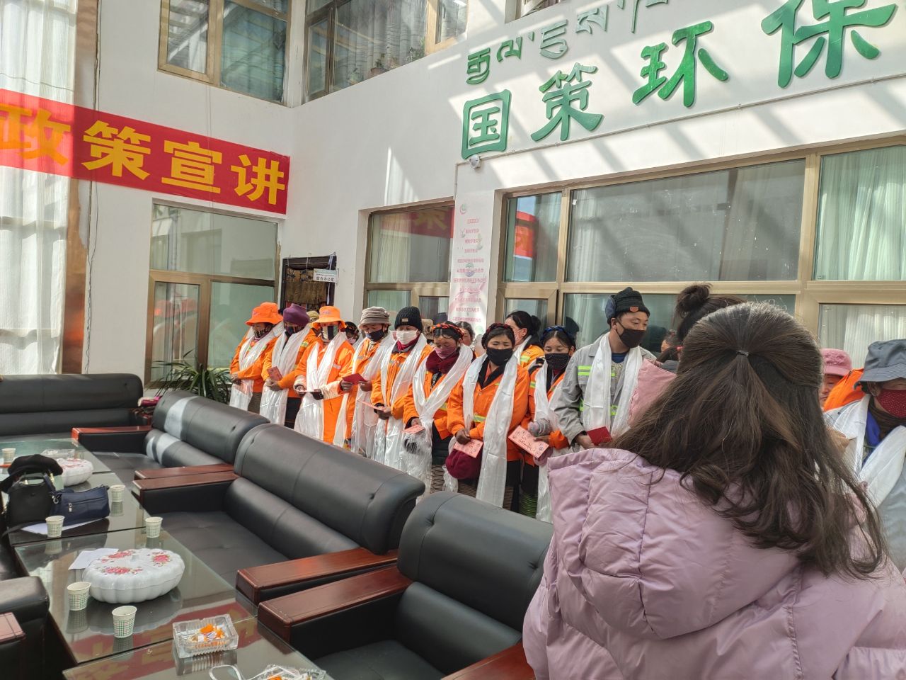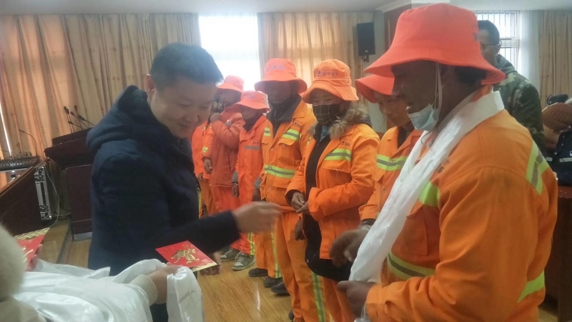 1月13日,日喀則桑珠孜區(qū)民政局區(qū)長前往國策環(huán)保日喀則分公司慰問公司環(huán)衛(wèi)工人,為他們一一獻上哈達,發(fā)放新年慰問金,向城市美容師致以敬意,并向他們送出了誠摯的新年祝福!