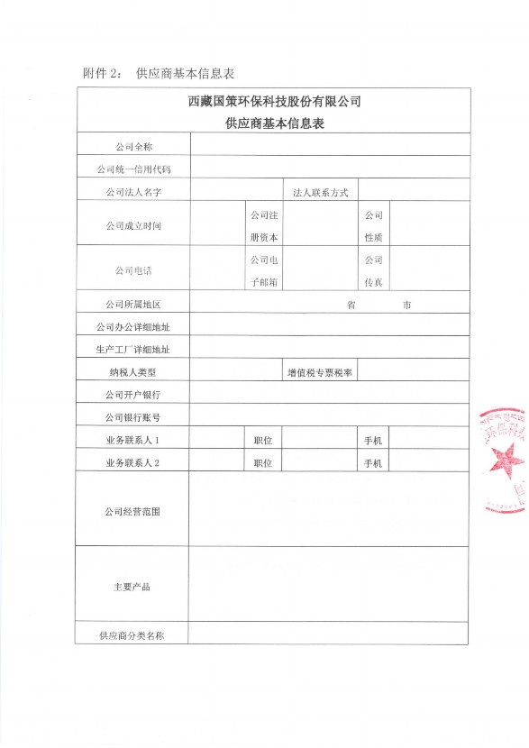 供應(yīng)商將資料整理成冊并每頁蓋章后掃描為PDF文件,發(fā)送至西藏國策環(huán)保科技股份有限公司采購郵箱:cg@guoce.com。