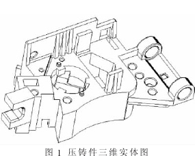 壓鑄件傳統(tǒng)的去毛刺方法由人工采用銼刀、刀具等手工工具對(duì)毛刺逐一去除,該方法耗工時(shí)長(zhǎng),生產(chǎn)效率低,而且像本文中的精密壓鑄件,對(duì)其精度要求高,因此人工去毛刺不能滿足使用的要求。另外,在用沖壓模去除冒口的時(shí)候也能將鑄件外周毛刺去除, 但該方法對(duì)內(nèi)部結(jié)構(gòu)處及細(xì)節(jié)處的毛刺不能去除。