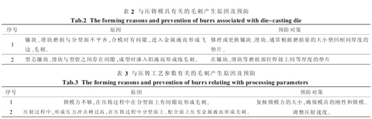 在生產(chǎn)過程中,毛刺產(chǎn)生的因素是多方面的,主要有壓鑄機(jī)性能的穩(wěn)定性、壓鑄工藝參數(shù)的選用、合金成分及熔煉工藝、脫模劑的使用、模具結(jié)構(gòu)的合理和制造質(zhì)量。從工程實(shí)際來說,壓鑄機(jī)的性能、模具結(jié)構(gòu)都是很少改變的,因此,如何調(diào)整壓鑄工藝參數(shù)及對(duì)模具的一些簡(jiǎn)單修理,從而提高產(chǎn)品質(zhì)量顯得特別重要。本文結(jié)合實(shí)際經(jīng)驗(yàn),總結(jié)了壓鑄模具和工藝參數(shù)可能產(chǎn)生毛刺的原因及預(yù)防對(duì)策,如表2、表3。