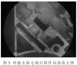 用以前的方法, 去毛刺質(zhì)量難以保證, 效果不穩(wěn)定,組裝后殘余毛刺因流體作用脫落剝離,以致可能影響產(chǎn)品的性能,而熱能去毛刺法對(duì)此類產(chǎn)品有較好的效果。本文鑄件用熱能毛刺機(jī)去除毛刺后的局部放大如圖3所示,可以看出,該鑄件毛刺基本都去除了,沒有殘留,而且沒有引起制品的二次損,尤其是在形狀復(fù)雜的細(xì)小部位。