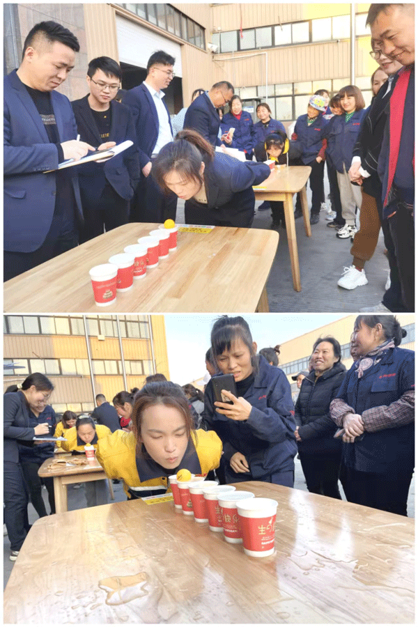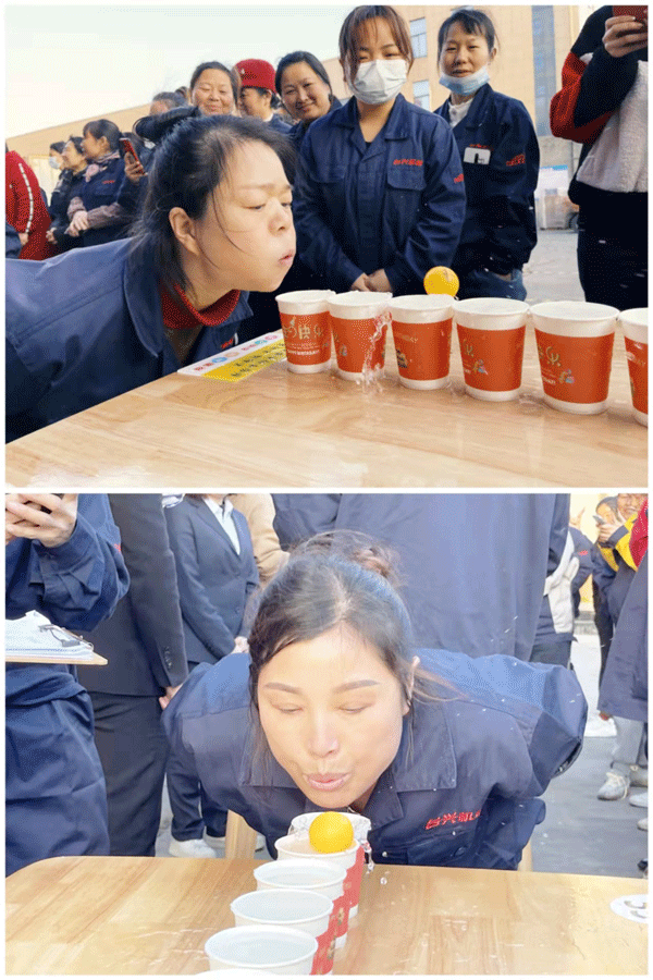 第一個游戲——“魚躍龍門”,共18名參賽選手,分3組,每組6人,每人面前有6個裝滿水的水杯,第1個水杯里放置乒乓球1枚,參賽者要用嘴巴吹氣,將乒乓球從第1個杯子吹到第6個杯子,并且要一個接一個地吹至下一個杯子內(nèi),直到吹入最后一個杯子,最后計(jì)算總成績,以用時最少的為勝。裁判長發(fā)令槍聲一響,所有人員都嚴(yán)格按照規(guī)則,氣運(yùn)丹田,卯足干勁,細(xì)心地、嚴(yán)謹(jǐn)?shù)亍⒕珳?zhǔn)地吹動乒乓球。游戲中,有不滿20歲的小姑娘,也有年近退休的老大姐,大家都積極踴躍地參與。有的選手費(fèi)了九牛二虎之力將乒乓球吹到第五個水杯時,卻不慎將球吹出了杯子,結(jié)果按照規(guī)則,必須重新開始。她們有懊惱跺腳的,也有開心鼓掌的,旁邊的觀眾也是群情高昂,吶喊聲、加油聲、歡笑聲不絕于耳,一開始就將整個活動推向了高潮。