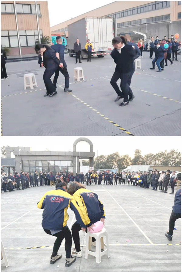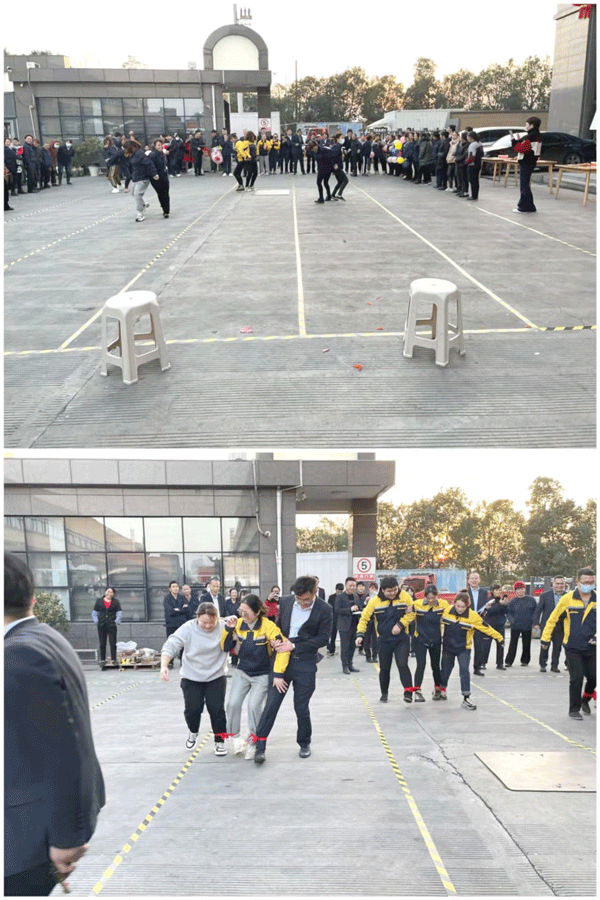 第二個游戲——“三人四足”,共60名參賽選手,3人組隊(duì),每隊(duì)站成一排,中間選手的左右腳與兩邊選手的右左腳用綁帶綁在一起(踝關(guān)節(jié)處),每隊(duì)選手在自己的跑道上集體前進(jìn),往返一趟,最后計(jì)算出所有參賽成績。60名選手,分別來自新廠、老廠、第二事業(yè)部的各個部門,女職工們還特邀“男伴”助陣?;顒又?,選手們精心準(zhǔn)備,從系綁帶,到排練、到找節(jié)奏,好不熱鬧。當(dāng)裁判長發(fā)令槍響起后,各隊(duì)選手邁著鏗鏘的步伐,在各自的節(jié)奏口令里,緊張有序地前行。有快速通過的,有慢而整齊的,也有不慎摔倒的,旁邊還有被現(xiàn)場氛圍感染的觀眾們。